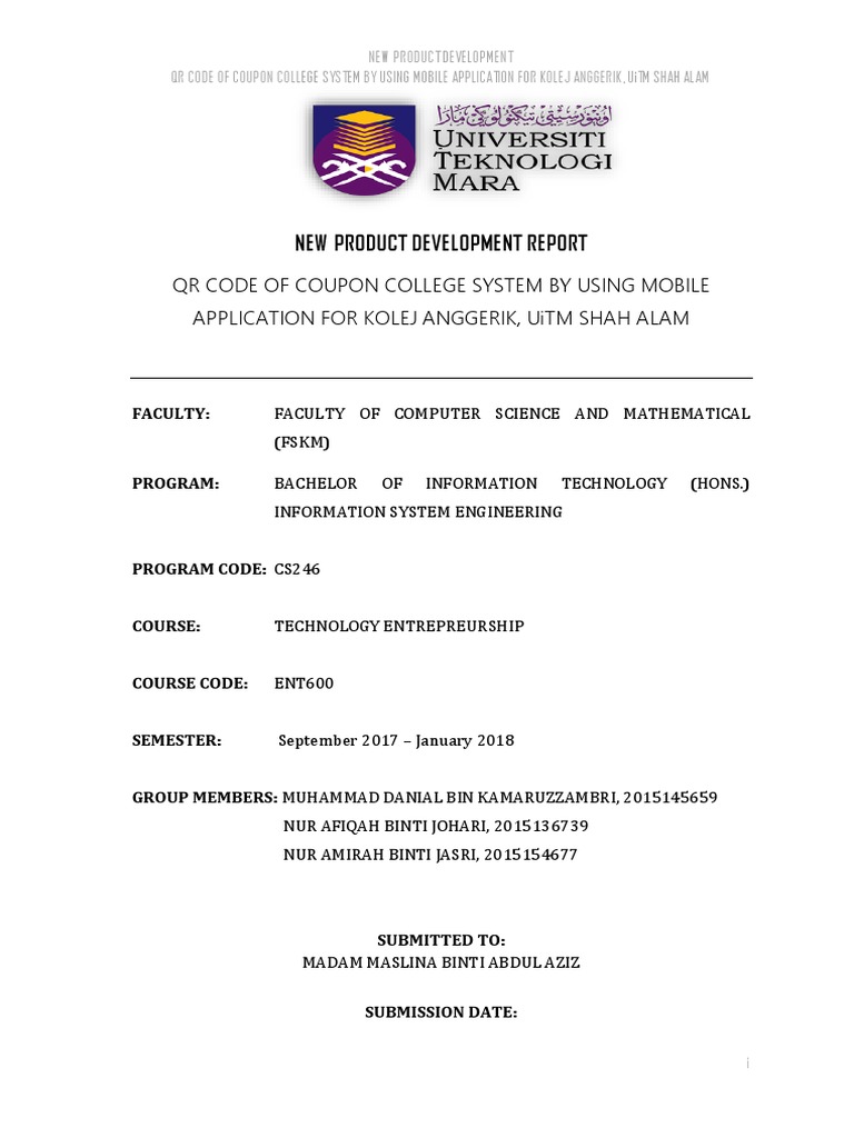 Up to 3 cash back New product development is defined as the process by which entrepreneur designs and creates new product or service that will be sold to customers. As students from UiTM Shah Alam we need to complete the New Product Development assignment to fulfill the ENT600 course. Uitm cawangan negeri sembilan kampus kuala pilah ent600 technology entrepreneurship new product development report fashion.